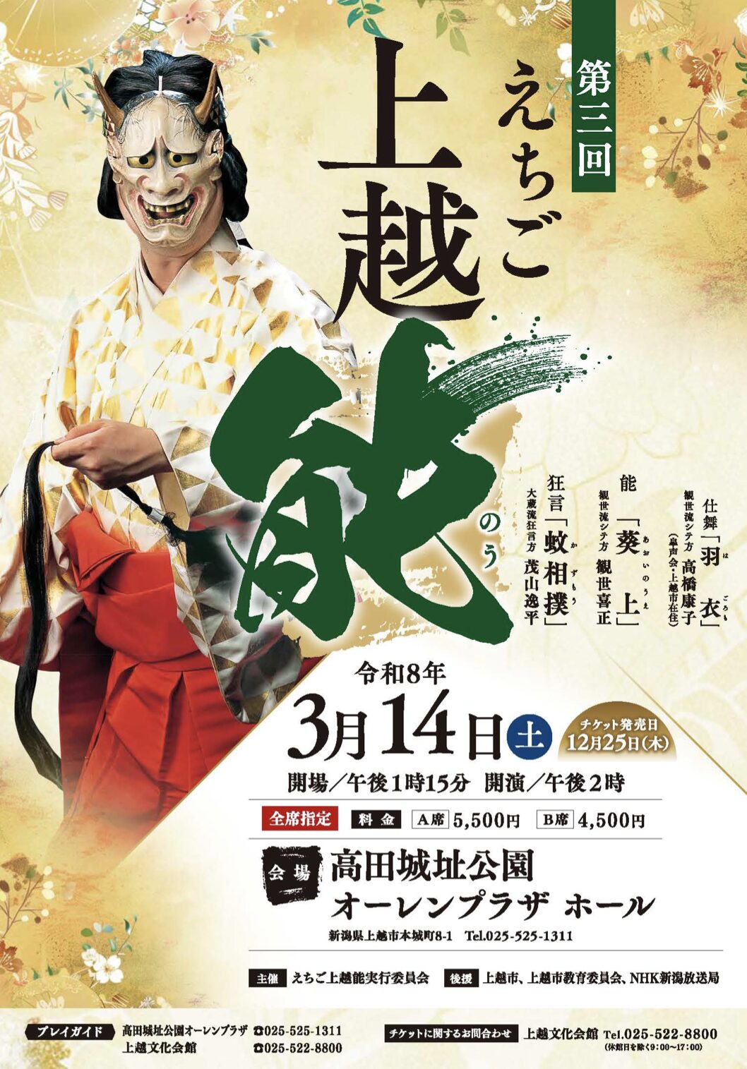 第三回えちご上越能(2026/3/14、高田城址公園オーレンプラザ) 2026-02-16 最終更新日時 : 2026-02-16 JUEM 日時:2026年3月14日(土)午後2時開演会場:高田城址公園オーレンプラザ ホール ・仕舞「羽衣」高橋康子・狂言「蚊相撲」茂山逸平・茂山茂・茂山千之丞・能「葵上」観世喜正・石井寛人・宝生常三・鈴木麻里・幸信吾・柿原孝則・桜井均 料金:A席5,500円、B席4,500円チケット取扱い:高田城址公園オーレンプラザ、上越文化会館問い合わせ:TEL025-522-8800(上越文化会館/休館日を除く9:00~17:00) (2026/2/16) \ 最新情報をチェック /