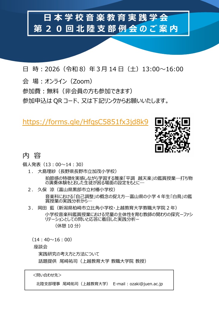 日本学校音楽教育実践学会 第20回北陸支部例会(2026/3/14、オンライン開催)